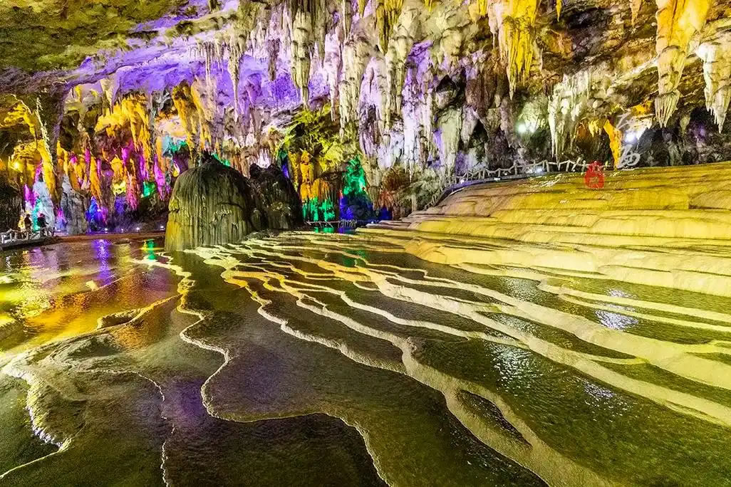 - 核心特色:洞內(nèi)分四層結構,已開放第二層約2公里游覽線,包含五大主題廳——吉星迎賓、壯鄉(xiāng)聽海、云山鑒水、詩畫田園、幽靜奇觀。景觀涵蓋鈣華池梯田、神象賜福、天下第一鐘等1000余處天然獨立景觀,其中鈣華池群面積達6000平方米,黑白對比形成獨特視覺奇觀。