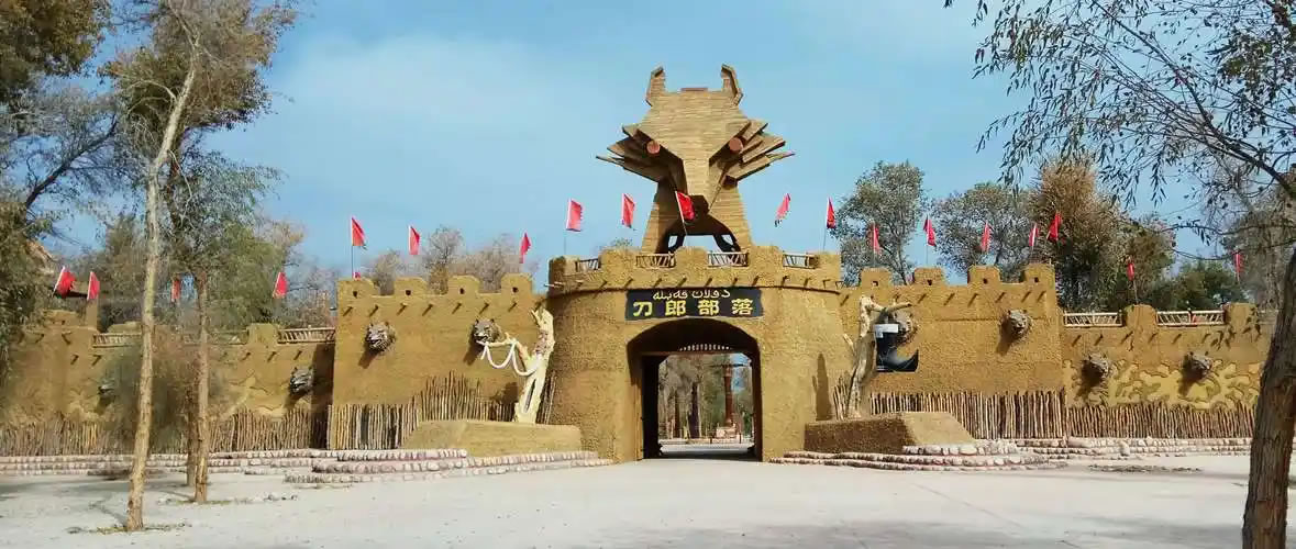刀郎部落,位于新疆維吾爾自治區(qū)阿克蘇地區(qū)阿瓦提縣玉滿閘口胡楊林區(qū),距阿克蘇市58公里、縣城18公里,占地面積8300畝。景區(qū)以5000余畝千年原始胡楊林為生態(tài)背景,完整呈現(xiàn)刀郎人建筑、飲食及民俗文化,集中展示刀郎木卡姆、刀郎麥西熱甫等8項(xiàng)國(guó)家級(jí)和自治區(qū)級(jí)非物質(zhì)文化遺產(chǎn),其中“刀郎演唱組合”保持著最大年齡民間歌舞組合的大世界基尼斯紀(jì)錄。核心功能區(qū)包含民俗展館、千年胡楊區(qū)、鴕鳥(niǎo)養(yǎng)殖園區(qū)等七大板塊,復(fù)原刀郎人傳統(tǒng)居所與勞作工具,設(shè)有傳統(tǒng)手工藝作坊和勇士競(jìng)技場(chǎng),每日開(kāi)展刀郎麥西熱甫展演、民俗婚禮體驗(yàn)及摔跤、叼羊等傳統(tǒng)體育活動(dòng)。2025年入選非遺進(jìn)景區(qū)“五好”案例名單,通過(guò)非遺傳承人駐場(chǎng)表演、慕薩萊思釀造工藝展示及沙雕主題公園等特色項(xiàng)目,形成生態(tài)觀光與民俗體驗(yàn)深度融合的旅游模式。景區(qū)內(nèi)保留狩獵場(chǎng)景、農(nóng)民畫(huà)長(zhǎng)廊及高空輪轉(zhuǎn)秋千表演,配套沉浸式互動(dòng)體驗(yàn)和文創(chuàng)開(kāi)發(fā)體系,實(shí)現(xiàn)刀郎文化的活態(tài)傳承。