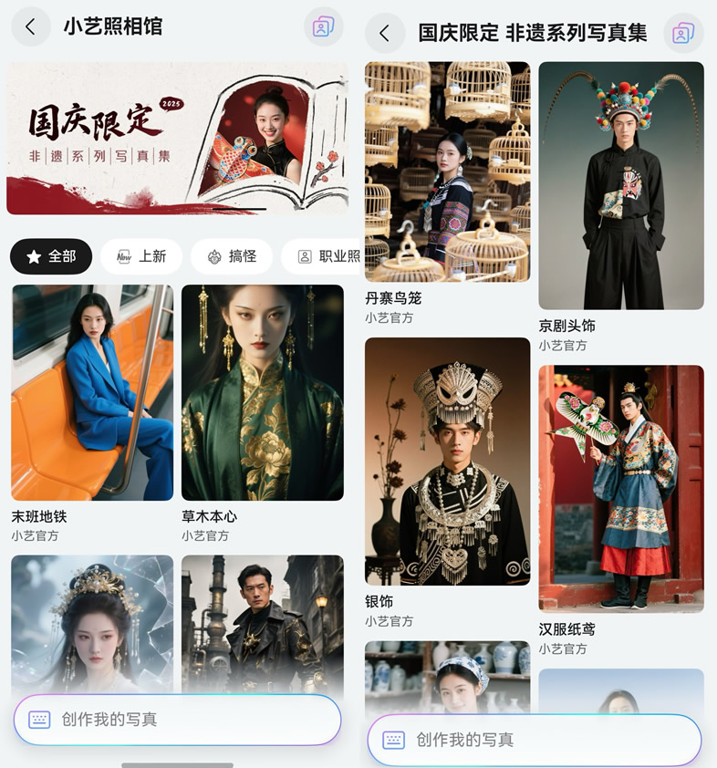 另外,對于想拍文化感滿滿的國風影像的用戶,小藝照相館Agent上線了國慶限定非遺系列模板,進入小藝App>右下角發(fā)現(xiàn)>智能體>小藝照相館后,在國慶限定專區(qū)選擇喜歡的模板,然后就可按步驟生成高質(zhì)量的國風寫真,打造專屬非遺系列寫真紀念冊。