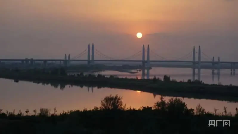 寧夏黃河濕地公園旁,黃昏時(shí)分橙紅落日西沉,橘粉色天際余暉傾灑在跨河大橋上,橋塔與拉索如巨人臂膀橫跨黃河,橋下黃河水波光粼粼與天空交相輝映,岸邊濕地植被靜默,飛鳥掠過蕩起漣漪,盡顯塞上江南黃昏盛景的詩意與壯美,令人沉醉。