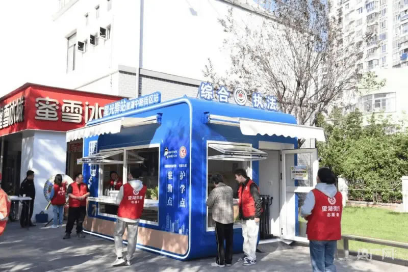 作為街區(qū)重要的“便民樞紐”,星光驛站功能定位清晰明確:面向戶外勞動者,這里是一座“能量補給站”,免費提供飲水、熱飯、充電等基礎服務,驅散奔忙的疲憊;對于周邊居民,它是一處“暖心港灣”,常態(tài)化開展義診、義剪等志愿服務,讓便利直達身邊;針對沿街商戶,驛站則是一個“助力平臺”,及時更新政策手冊、提供證照辦理咨詢,助力經(jīng)營發(fā)展。